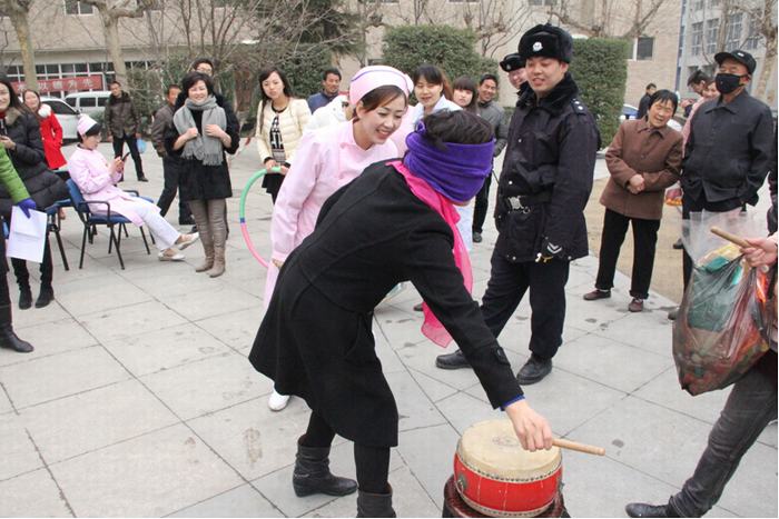 當(dāng)日下午15:00,工會(huì)副主席亓梅宣布活動(dòng)開始,首先進(jìn)行了“猜燈謎”游戲環(huán)節(jié),燈謎剛擺上場(chǎng)就被熱情的醫(yī)生、護(hù)士們?nèi)坎轮?,而后進(jìn)行的“蒙眼擊鼓”環(huán)節(jié),參與游戲的職工更是熱情高漲,拿上鼓槌,用紅布將眼睛蒙上,原地轉(zhuǎn)三圈,然后在黑暗中找到并敲響鼓,參與者樂在其中,排隊(duì)游戲的人絡(luò)繹不絕,但秩序井然,中心花園上不斷傳出歡樂的笑聲。