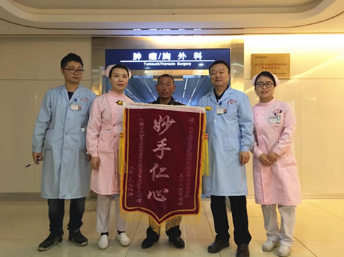 甘肅患者石某,61歲。因咳嗽,咳痰,呼吸困難在當?shù)蒯t(yī)院治療效果不佳,病情加重,慕名前來我院診治。以肺部感染肺膿腫并膿胸收住腫瘤胸外科?;颊呷胱r口唇發(fā)紺、呼吸困難,氣促,咳大量黃色粘痰,高燒達39.5℃,心率快,氧飽和度低,已出現(xiàn)感染性休克表現(xiàn),隨時都有生命危險。苗滿園主任立即組織緊急搶救,迅速確立“雙引流雙循環(huán)沖洗新術(shù)式胸腔閉式引流”的治療方案,即行急診手術(shù)。術(shù)后護理團隊在護士長的帶領(lǐng)下對病情進行充分評估,除胸腔引流常規(guī)護理之外,還指導患者堅持做“呼吸功能訓練操”進行康復鍛煉,患者快速痊愈,順利出院。并送“妙手仁心”的錦旗表達感激之情。