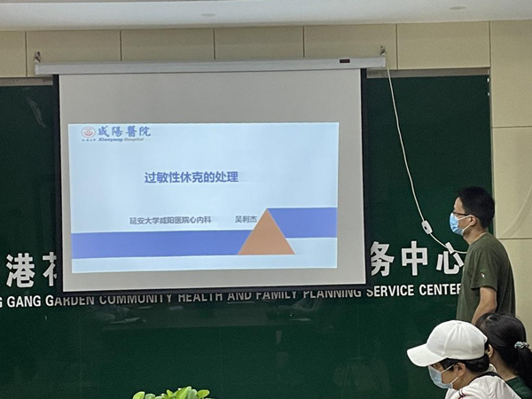 培訓運用多媒體課件,首先由延安大學咸陽醫(yī)院心內(nèi)一病區(qū)吳利杰責任總醫(yī)師講述了過敏性休克的識別及正確處理,強調(diào)了早期識別過敏性休克的重要性,及時正確地處理,防止病情進展,贏得黃金救治時間,改善患者預后。接著張博昆醫(yī)生對如何判斷病人心跳呼吸停止、心肺復蘇的指征、操作步驟、救治過程中的注意事項、復蘇成功的標志等進行了詳細的講授和演示,著重強調(diào)新的CPR進展、新的五環(huán)生存鏈、新的CPR操作順序。