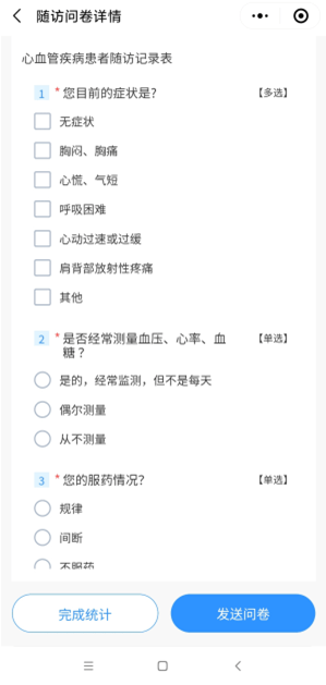 管理靈活性強,科室可根據(jù)隨訪需求自行設計問卷內(nèi)容,并按照診斷標簽批量對住院及出院患者發(fā)送調(diào)查問卷,如:高血壓監(jiān)測隨訪問卷、腦神經(jīng)治療隨訪問卷、新生嬰兒隨訪問卷、產(chǎn)后隨訪問卷、出院滿意度等。此外,系統(tǒng)也可根據(jù)診斷標簽精準批量完成對患者的健康宣教。